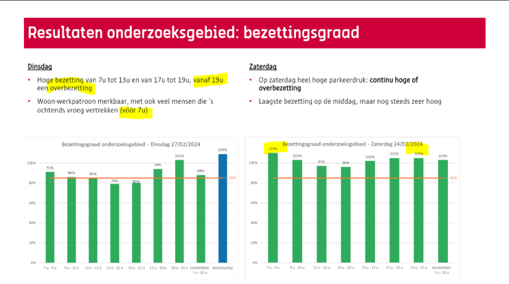 In Hoboken bijvoorbeeld heeft het stadsbestuur parkeeronderzoeken laten uitvoeren. Daaruit blijkt dat de parkeerdruk inderdaad hoog is, de hele dag door. Maar pas vanaf 19u ‘s avonds en ‘s nachts is er sprake van overbezetting. Logisch, want dat is natuurlijk het moment dat de meeste mensen van hun werk terugkomen en een plekje voor hun auto nodig hebben. De overbezetting duurt tot een uur of negen ‘s ochtends, wanneer de meeste mensen terug naar het werk zijn getrokken.