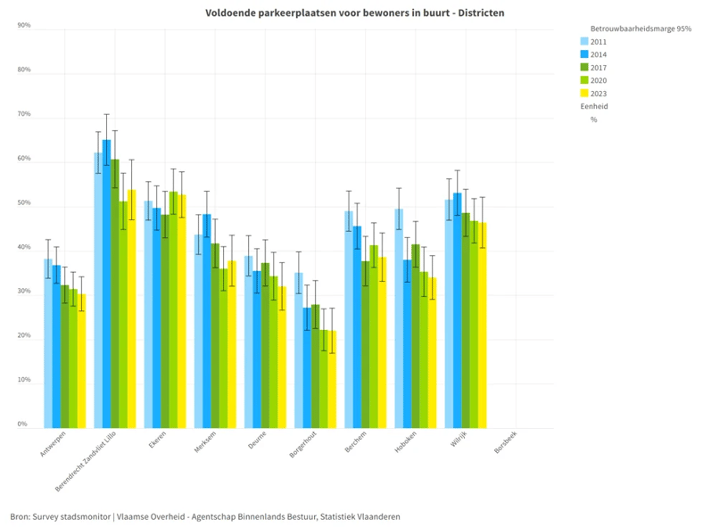 In 2019 werden betalend parkeren ingevoerd buiten de ring, in Berchem, Deurne, Merksem en op ‘t Kiel. Ook toen werden mensen gesust met het feit dat het gepaard zou gaan met bewonersparkeren. Vooral mensen die ’s avonds laat thuiskomen, zoals zorgverleners of arbeiders in ploegenstelsels, getuigen dat ze nog steeds lang moeten rondrijden om een parkeerplaats te vinden. Dat beeld wordt ondersteund door cijfers. Onderzoek van Statistiek Vlaanderen toont aan dat tevredenheid over het aantal beschikbare parkeerplaatsen in de drie districten in kwestie er niet op vooruit is gegaan, integendeel. Neem nu Deurne: in 2017 gaf 37% van de inwoners daar aan dat er voldoende parkeergelegenheid voor bewoners was. In 2023, vier jaar na de invoering van de roze zone daar, was dat nog 32%. Het probleem blijft dus bestaan, ondanks de nieuwe betalende zones.